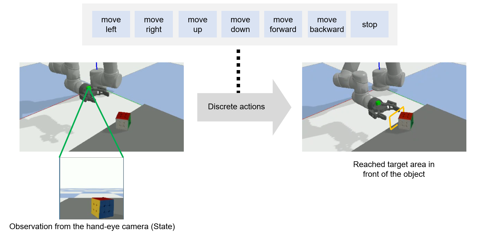 We consider our approach for the task of closed-loop object reaching via discrete actions. Our 6 DoF robot arm (UR5) is equipped with a two-finger parallel gripper (Robotiq 2F-85) with a camera mounted on top indicated by the green block which we refer to as the hand-eye camera. The agent receives RGB images from the hand-eye camera at each timestep and performs an action out of a set of 7 discrete actions. The goal of the task is for the robot to reach a predefined target area in front of the object indicated by the yellow box.