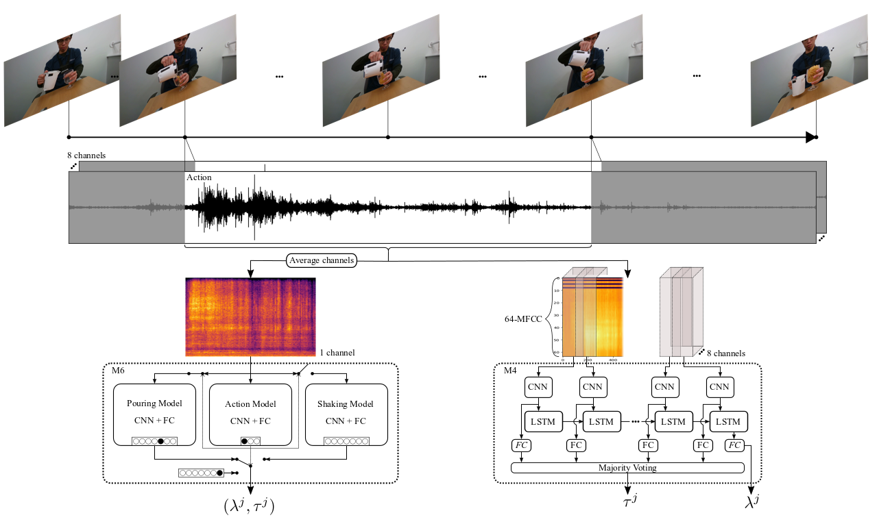 The solution provided by Donaher et al. in “Audio classification of the content of food containers and drinking glasses” jointly estimates the filling type and level to avoid infeasible cases (e.g., empty water or half-full none). The solution decomposed the problem into two steps, namely action recognition and content classification, and devised three independent CNNs. The first CNN (action classifier) identifies the manipulation performed by the human, i.e., shaking or pouring, and the other two CNNs are task-specific and determine the filling type and level. The choice of which task-specific network should be used is conditioned by the decision of the first CNN.