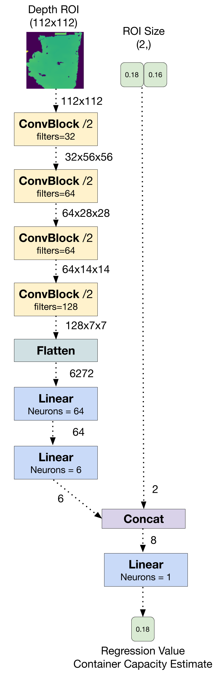 The solution provided by Christmann and Song recognises the filling type with a neural network consisting of 2 convolutional layers and 1 linear layer and taking 40 normalized MFCC features as input. The solution also regresses the container capacity by extracting a region of interest (ROI) around the object localised in the depth data of the frontal view and providing the ROI and its size to a neural network that has 4 conv-batchnorm layers followed by 3 linear layers.